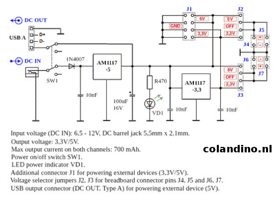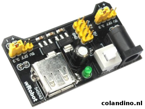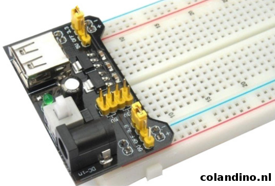 Een zeer handige power supply om aan te sluiten op een breadboard met dubbele voedingsrails (standaard bordjes).